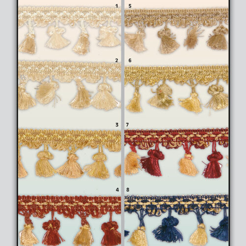 Κρόσσι με φουντάκια σε ποικιλία χρωμάτων με φάρδος 6,5 εκατοστών. Η τιμή αφορά το ένα μέτρο ή το ένα τόπι (25 μέτρα).