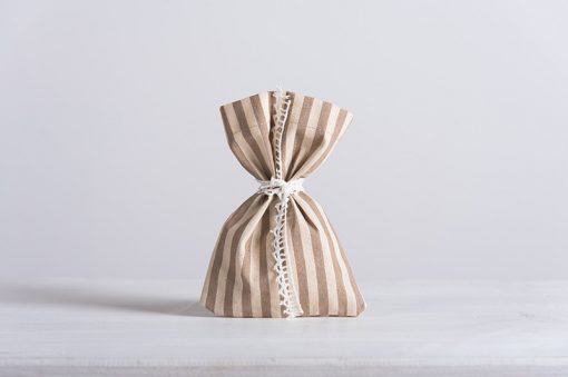 Πουγκί υφασμάτινο ριγέ εκρού με μπεζ σε διάσταση 12 x 17 εκατοστών. Το προιόν βρίσκεται σε συσκευασίες των 10 τεμαχίων. Η τιμή αφορά το τεμάχιο.