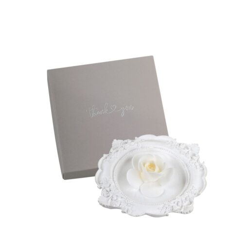 Ένα ρομαντικό αριστούργημα γεμάτο διαχρονική φινέτσα, όπου το σκαλιστό vintage πιατάκι αγκαλιάζει ένα υπέροχο τριαντάφυλλο, ενώ η elegant συσκευασία ολοκληρώνει την πιο εκλεπτυσμένη πρόταση δώρου που θα μαγέψει και θα συναρπάσει.