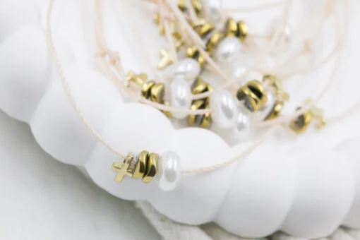 Μαρτυρικό βραχιόλι με εκρού κορδόνι, λευκή πέρλα και αιματίτης χρυσός και επιχρυσωμένος σταυρός. Οι φωτογραφίες έχουν υποστεί επεξεργασία και τα χρώματα ίσως να διαφέρουν λίγο στην πραγματικότητα. Η τιμή αφορά συσκευασία 50 τεμαχίων.