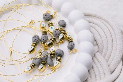 Μαρτυρικό βραχιόλι σύρμα memories, αιματίτης, γκρι λάβα, λευκό μάτι και επιχρυσωμένος σταυρός σε σχήμα ρόμβος. Οι φωτογραφίες έχουν υποστεί επεξεργασία και τα χρώματα ίσως να διαφέρουν λίγο στην πραγματικότητα. Η τιμή αφορά συσκευασία 50 τεμαχίων.