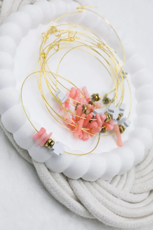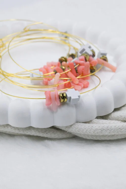 Μαρτυρικό βραχιόλι, με σύρμα memories, κοράλλια, χρυσές χάντρες αιματίτης και ξύλινος σταυρός λευκός. Οι φωτογραφίες έχουν υποστεί επεξεργασία και τα χρώματα ίσως να διαφέρουν λίγο στην πραγματικότητα. Η τιμή αφορά συσκευασία 50 τεμαχίων.