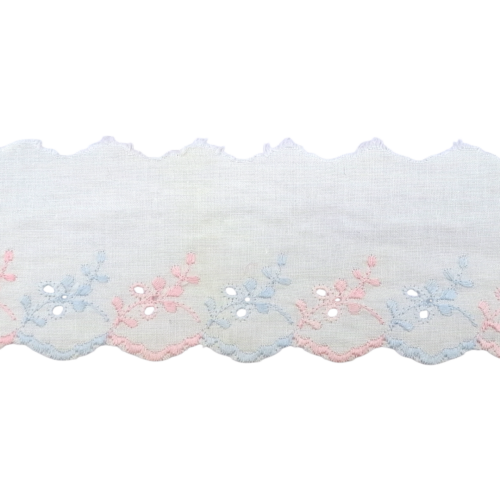 Δαντέλα βαμβακερή ασπροκέντημα με λουλούδια σε φάρδος 12 εκατοστών. Η τιμή αφορά το ένα μέτρο.