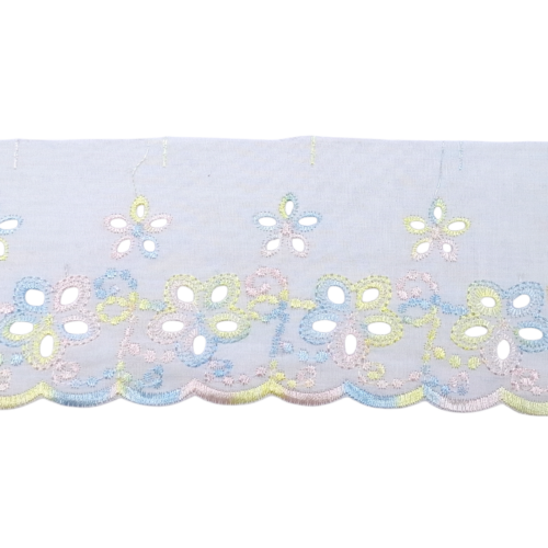 Δαντέλα βαμβακερή ασπροκέντημα με λουλούδια σε φάρδος 12 εκατοστών. Η τιμή αφορά το ένα μέτρο.