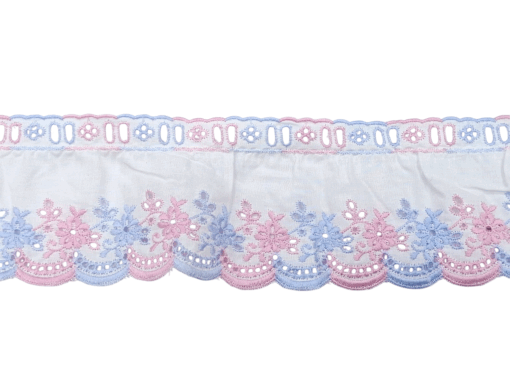 Δαντέλα ασπροκέντημα με ροζ και σιελ λουλουδάκια με φάρδος 8 εκατοστών. Η τιμή αφορά το ένα μέτρο.