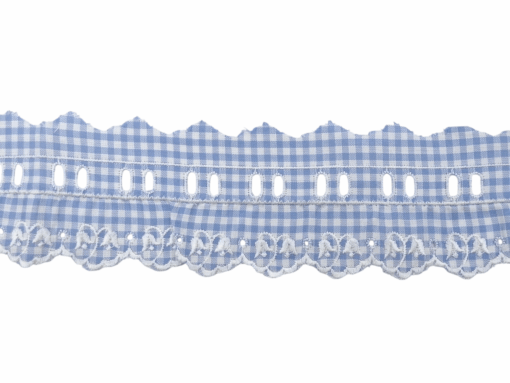 Δαντέλα βαμβακερή ασπροκέντημα – μπροντερί σιελ σε φάρδος 4,5 εκατοστών. Η τιμή αφορά το ένα μέτρο.