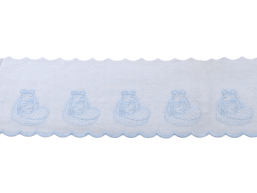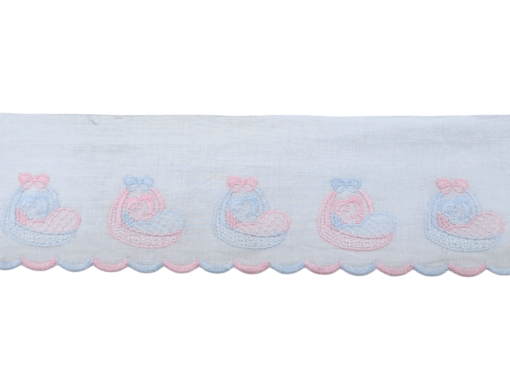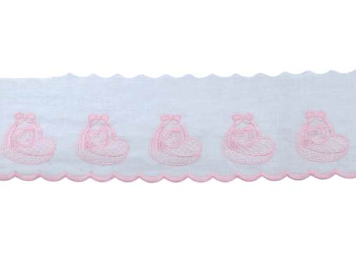 Δαντέλα βαμβακερή ασπροκέντημα λευκή με ροζ ή σιελ καλαθούνα με φάρδος 7 εκατοστών. Η τιμή αφορά το ένα μέτρο.