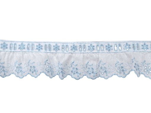 Δαντέλα ασπροκέντημα λευκό με σιελ λουλουδάκια σε φάρδος 6,5 εκατοστών. Η τιμή αφορά το ένα μέτρο.