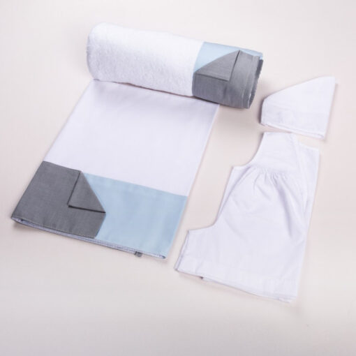 Σετ λαδόπανο δίχρωμο για αγόρι. Το σετ περιλαμβάνει λαδόπανο , πετσέτα και εσώρουχο με το καπελάκι.