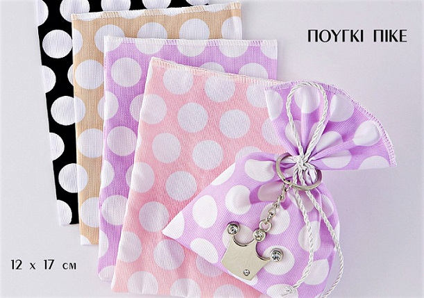Πουγκί υφασμάτινο πικέ πουά σε διάσταση 12 x 17 εκατοστών. Το προϊόν διατίθεται σε συσκευασίες των 10 τεμαχίων ανά χρώμα. Ελάχιστη παραγγελία μια συσκευασία των 10 τεμαχίων ανά χρώμα. Η τιμή αφορά το τεμάχιο.