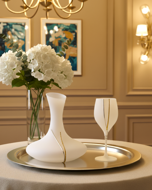 α) Καράφα γυάλινη λευκή KN4019 διακοσμημένη με μία economy line ασημί βέργα και μία επιχρυση διαμανταριστή βέργα
