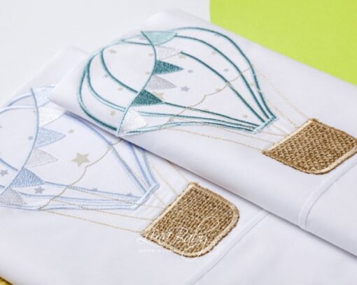 Βαμβακερό σετ λαδόπανου σε 2 χρωματικούς συνδυασμούς, Λευκό-Σιέλ & Λευκό-Μέντα. Το κέντημα «αερόστατο» ολοκληρώνεται με 2 τύπους απλικέ πικέ και τσουβάλι.