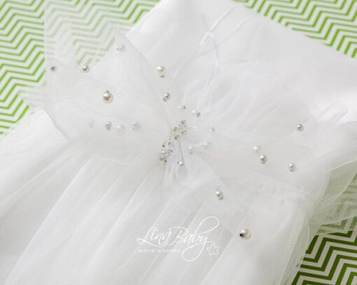 Ονειρικό βαμβακερό σετ λαδόπανων σε εκρού χρώμα με βολάν από τούλι ροζ και διακοσμητικό φιόγκο με πέρλες και στρας.