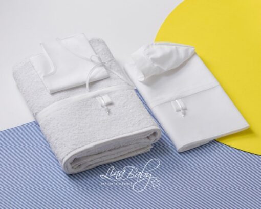 Απλό και κομψό βαμβακερό σετ λαδόπανων σε λευκό χρώμα με πικέ τρεσα και διακοσμητικά χαντράκια σε λευκό και σιέλ χρώμα.