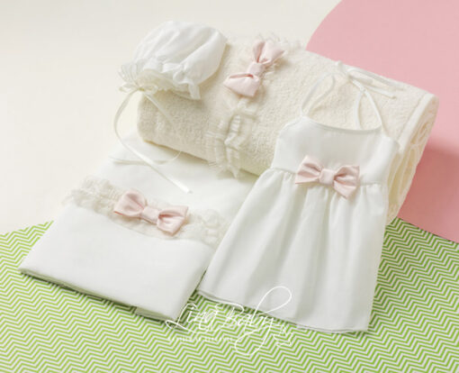 Εκρού βαμβακερό σετ λαδόπανων, διακοσμημένο με εντυπωσιακή διπλή τρέσα–βολάν και έναν χειροποίητο σατέν φιόγκο σε απαλή πούδρα απόχρωση.