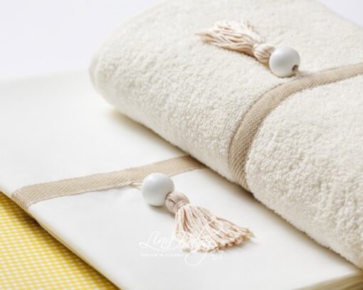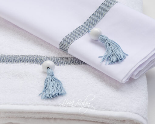 Βαμβακερό σετ λαδόπανου σε Λευκό και Ιβουάρ χρώμα με διακοσμητική τρέσα σε Μπλέ και Μπέζ (αντίστοιχα) και φουντίτσα με λευκή ξύλινη χάντρα.