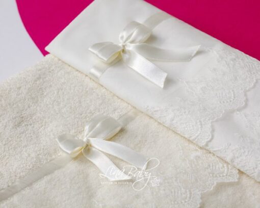 Για τους λάτρεις των παραμυθιών ενα ονειρικό βαμβακερό σετ λαδόπανων σε ιβουάρ χρώμα με διπλές στρώσεις από Γαλλική δαντέλα και σατέν τρέσα στο τελείωμα του.