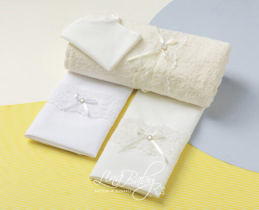 Aπόλυτη κομψότητα σε κάθε λεπτομέρεια: βαμβακερό σετ σε λευκό & εκρού, διακοσμημένο με φαρδιά δαντέλα κορδονέ, σατέν φιογκάκι και εμβληματικό κουμπάκι με στρας & πέρλα. Ένα σετ που συνδυάζει υψηλή αισθητική, φινέτσα και πολυτέλεια, ιδανικό για όποιον θέλει η βάπτιση να γίνει μια μοναδική, αληθινά λαμπερή στιγμή. Luxury details, unforgettable moments. Πετσέτα 80*140*450gr2. Πετσέτα παπά 30*40*450gr2. Ολες οι πετσέτες της Lina Baby φέρουν την ετικέτα STANDARD 100 by OEKO-TEX® (Αυτό σημαίνει ότι τα προϊόντα δεν περιέχουν επιβλαβή επίπεδα χημικών ουσιών.)