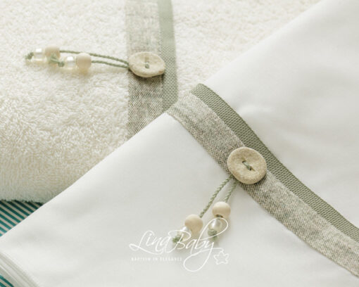 Εκρού βαμβακερό σετ λαδόπανων με χακί τρέσα, λαδί μελανζέ ρέλι και boho λεπτομέρειες με κουμπί & χαντρούλες.