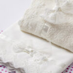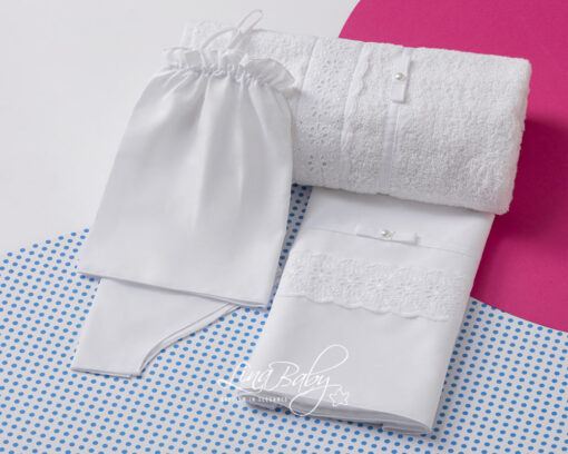 Υπέρκομψο βαμβακερό σετ λαδόπανων σε λευκό χρώμα, με Broderie Anglais Εntredeux τρέσα και βαμβακερή κορδέλα με φιογκάκι και πέρλα.