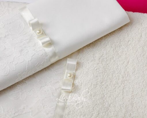 Ρομαντικό και φινετσάτο βαμβακερό σετ λαδόπανων σε εκρού χρώμα με φάσα από γαλλική δαντέλα είκοσι πόντων και σατέν κορδέλα με φίογκο.
