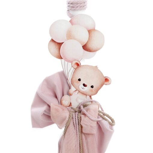 Ολοκληρωμένο βαπτιστικό σετ με θέμα το Αρκουδάκι με Μπαλόνια, διακοσμημένο με υψηλής ποιότητας UV εκτύπωση σε ρομαντικές αποχρώσεις του ροζ και του λευκού. Ένα γλυκό και αέρινο σετ, ιδανικό για μια κομψή βάπτιση.