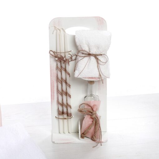 ✔ Σετ λαδιού με μπουκαλάκι, σαπούνι και κεράκια, διακοσμημένα σε απαλούς ροζ τόνους με φιόγκους και κορδέλες.