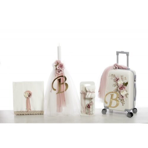 ✔ Σετ λαδιού με μπουκαλάκι, σαπούνι και κεράκια, διακοσμημένα σε απαλούς ροζ τόνους με φιόγκους και κορδέλες.