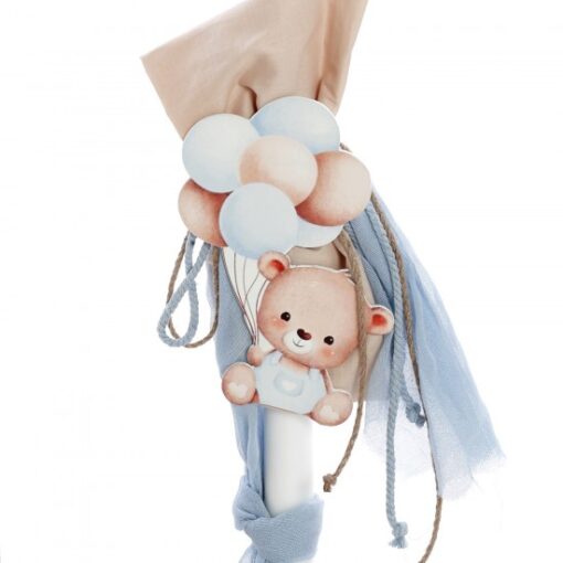 ✔ Λαμπάδα βάπτισης, διακοσμημένη με ξύλινο στοιχείο αρκουδάκι, μπαλόνια από ύφασμα, κορδέλες και αέρινα γαλάζια υφάσματα.