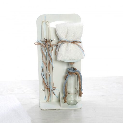 ✔ Σετ λαδιού με μπουκαλάκι, σαπούνι και κεράκια, διακοσμημένα σε απαλά γήινα χρώματα με κορδέλες και σχοινιά.