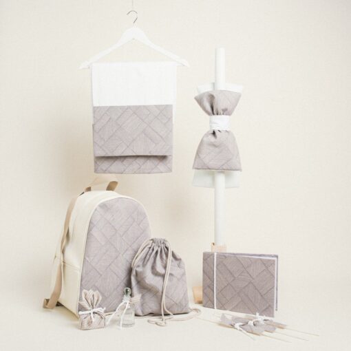 Ένα κομψό και μοντέρνο σετ βάπτισης με σχέδιο διαγώνιες γραμμές σε μπεζ απόχρωση, ιδανικό για μια minimal και εκλεπτυσμένη βάπτιση.