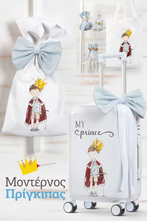 Σετ βάπτισης για αγόρι με βαλίτσα τροχήλατη ταξιδιού με χειροποίητη ζωγραφική και θέμα Μοντέρνος Πρίγκιπας.