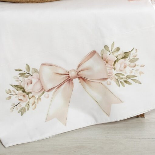 Λαδόπανα: Πλήρες σετ (πετσέτες, εσώρουχα) με τυπωμένη παράσταση του floral φιόγκου, απόλυτα εναρμονισμένη με το θέμα.