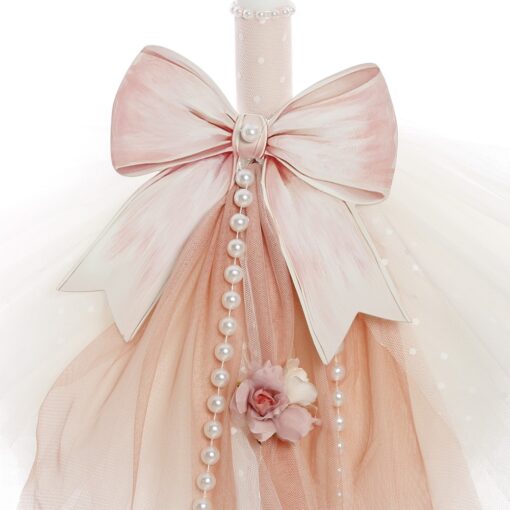 Λαμπάδα: Εντυπωσιακή λαμπάδα με “φούστα” από τούλι σε λευκό και σομόν χρώμα, στολισμένη με μεγάλο ξύλινο διακοσμητικό φιόγκο και πέρλες.