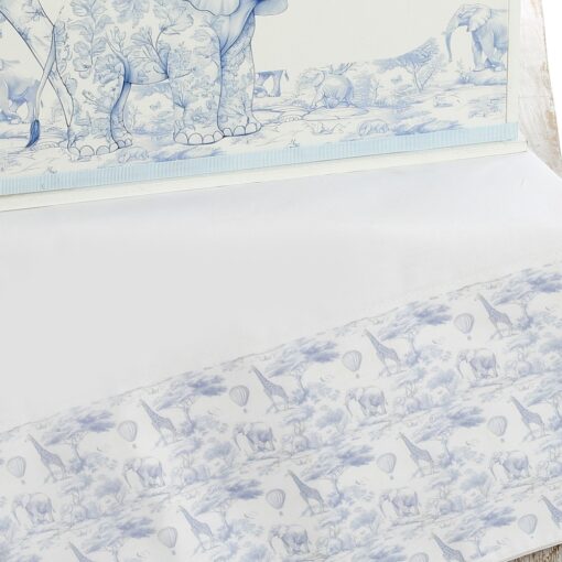 Ξύλινο Κουτί: Τετράγωνο ξύλινο κουτί αποθήκευσης με εντυπωσιακή εκτύπωση που απεικονίζει ζώα της ζούγκλας (καμηλοπάρδαλη, ελέφαντας) σε αριστοκρατικό γαλάζιο φόντο. Στην πρόσοψη δεσπόζει ένα χρυσό μονόγραμμα (π.χ. “Κ”), ενώ το καπάκι στολίζεται με υφασμάτινους φιόγκους και ναυτικό κορδόνι. (Διαστάσεις: 45cm x 38cm x 38cm).