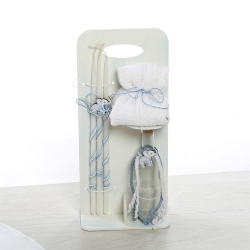 Σετ Λαδιού: Λευκό ξύλινο stand που περιλαμβάνει μπουκάλι λαδιού, σαπούνι και 3 κεράκια κολυμπήθρας, όλα ασορτί διακοσμημένα με γαλάζιες λεπτομέρειες.