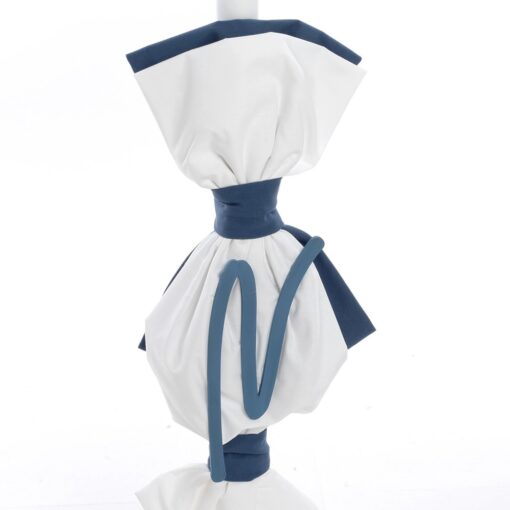 Λαμπάδα: Μοντέρνος και λιτός στολισμός με πλούσια λευκά υφάσματα που δένονται περίτεχνα σε κόμπους με φαρδιές navy blue κορδέλες, δημιουργώντας ένα εντυπωσιακό γεωμετρικό αποτέλεσμα.