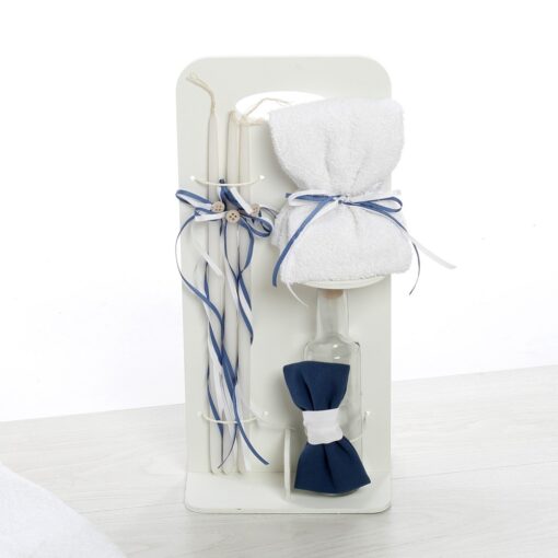 Σετ Λαδιού: Λευκό ξύλινο stand που περιλαμβάνει μπουκάλι λαδιού, σαπούνι και 3 κεράκια κολυμπήθρας, όλα ασορτί διακοσμημένα με λιτούς μπλε φιόγκους.
