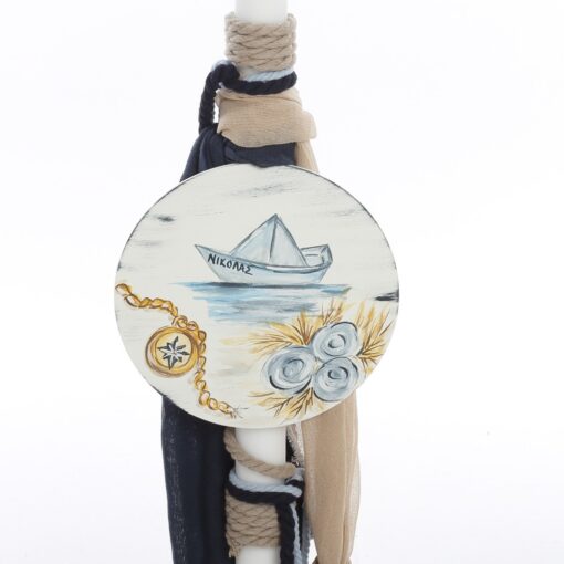 Λαμπάδα: Στολισμένη με πλούσιες γάζες σε μπεζ και navy blue χρώμα, χοντρά σχοινιά και ένα ξύλινο στρογγυλό κάδρο με ζωγραφιστό θέμα το χάρτινο καραβάκι.