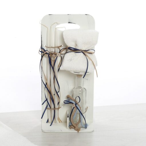 Σετ Λαδιού: Λευκό ξύλινο stand που περιλαμβάνει μπουκάλι λαδιού, σαπούνι και 3 κεράκια, όλα ασορτί διακοσμημένα με λεπτά σχοινάκια και κουμπιά.