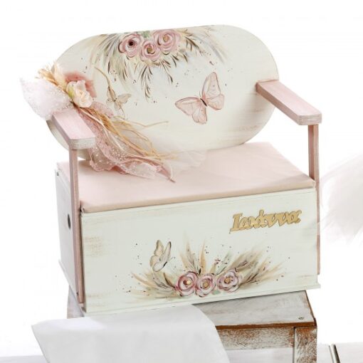✔ Ξύλινο παγκάκι-κουτί βάπτισης ζωγραφισμένο στο χέρι, με vintage τριαντάφυλλα, πεταλούδες και χρυσές λεπτομέρειες. (Διαστάσεις: 50cm x 52cm x 32cm)