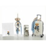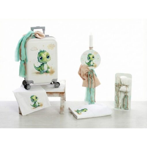 Ολοκληρωμένο πακέτο βάπτισης για αγόρι με θέμα “Δεινοσαυράκι” σε υψηλής αισθητικής εικονογράφηση watercolor (ακουαρέλα), τοποθετημένο σε πρακτική βαλίτσα τρόλεϊ. Ένα μοντέρνο και ιδιαίτερα δημοφιλές θέμα.