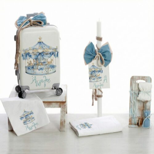 Ολοκληρωμένο πακέτο βάπτισης για αγόρι με θέμα “Baby Elephant” (Ελεφαντάκι) σε στυλ watercolor, τοποθετημένο σε πρακτική βαλίτσα τρόλεϊ. Μια διαχρονική επιλογή με απαλές αποχρώσεις και υψηλή αισθητική.