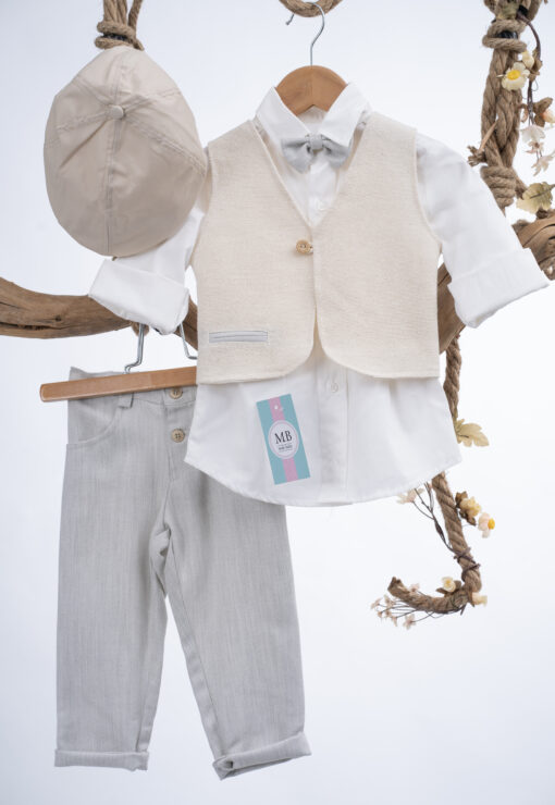 Βαπτιστικό κουστουμάκι για αγόρι που περιλαμβάνει το παντελόνι, πουκάμισο, γιλέκο, παπιγιόν και καπέλο.