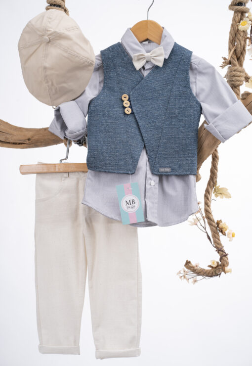 Βαπτιστικό κουστουμάκι για αγόρι που περιλαμβάνει το παντελόνι, πουκάμισο, γιλέκο, παπιγιόν και καπέλο.