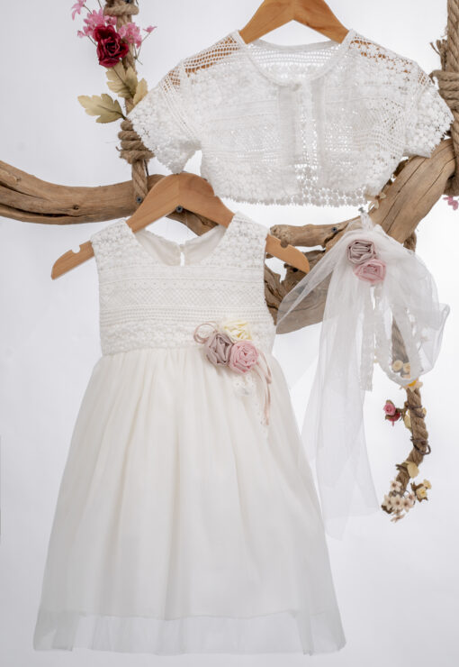 Βαπτιστικό φόρεμα για κορίτσι με λουλούδι και μπολερό. Παράδοση σε περίπου 15 ημέρες.
